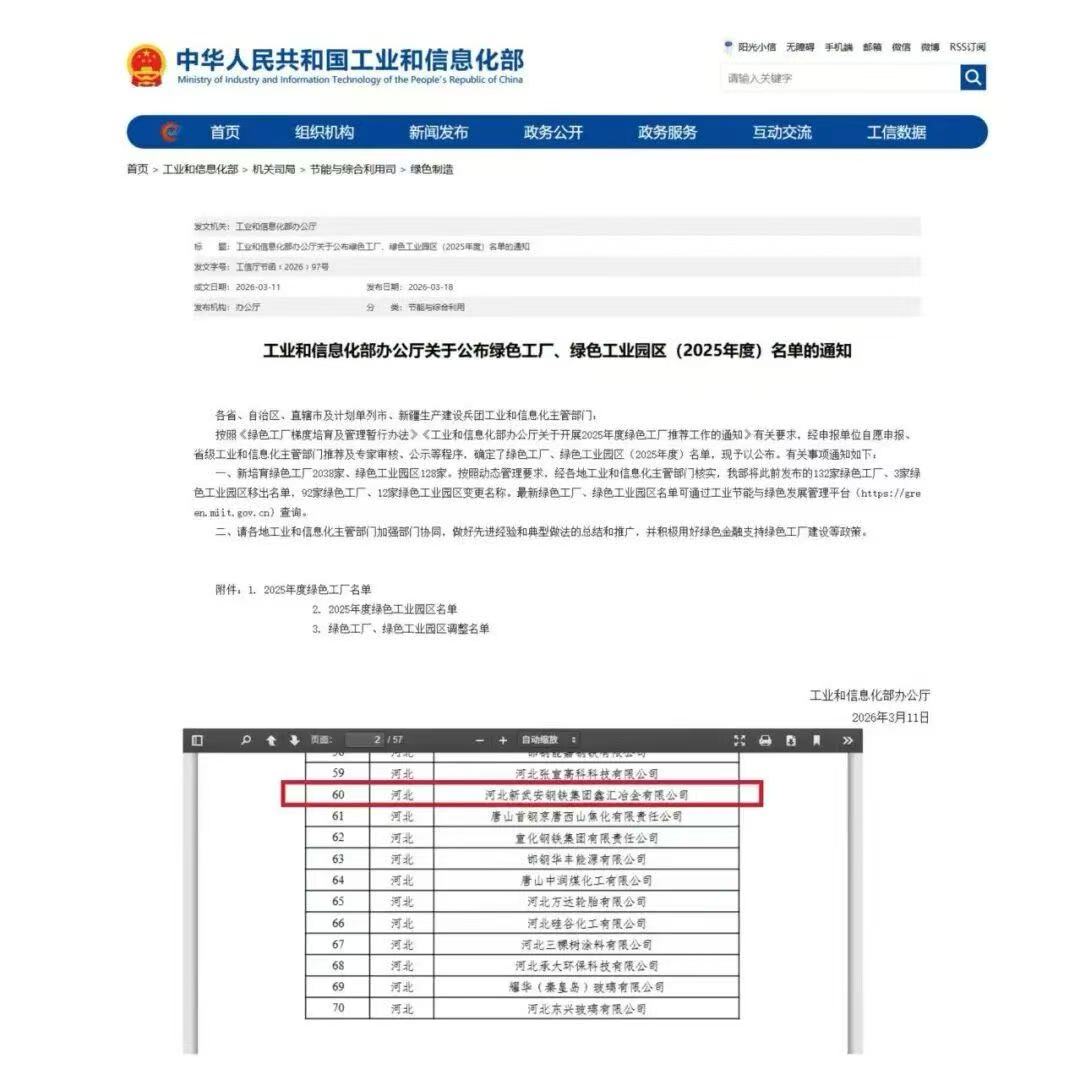 2026年3月18日,工業和信息化部辦公廳正式發布《關于公布綠色工廠、綠色工業園區(2025年度)名單的通知》,河北新武安鋼鐵集團鑫匯冶金有限公司(以下簡稱“鑫匯冶金”)憑借電爐短流程煉鋼的綠色技術優勢與全鏈條低碳發展體系,成功獲評國家級綠色工廠。這是對公司長期堅持綠色低碳發展、積極踐行國家“雙碳”戰略的權威認可與最高褒獎,更是公司作為區域綠色制造標桿企業的重磅榮譽。